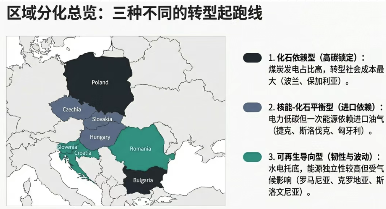 在俄乌冲突的狂风暴雨洗礼后,中东欧的能源安全底线被彻底击穿并重塑。然而,面对“安全转型”与“绿色转型”的双重压力,这些国家并没有手挽手走上同一条路。相反,受制于各自不同的“家底”(资源禀赋)、历史包袱与产业命脉,中东欧能源版图正发生着剧烈的地壳运动,最终硬生生撕裂出三条截然不同的转型路线:化石燃料依赖型、核能—化石能源平衡型与可再生能源导向型。这绝非简单的政策摇摆,而是一场关乎国家命运的“三分天下”。